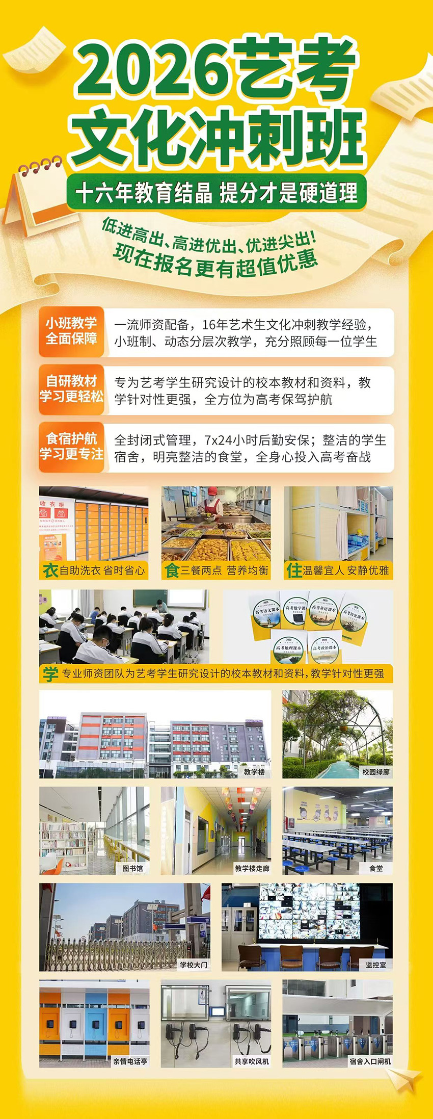 小班教学全面保障 -流师资配备,16年艺术生文化冲刺教学经验小班制、动态分层次教学,充分照顾每一位学生 自研教材学习更轻松 专为艺考学生研究设计的校本教材和资料,教学针对性更强,全方位为高考保驾护航 食宿护航学习更专注 全封闭式管理,7x24小时后勤安保;整洁的学生宿舍,明亮整洁的食堂,全身心投入高考奋战